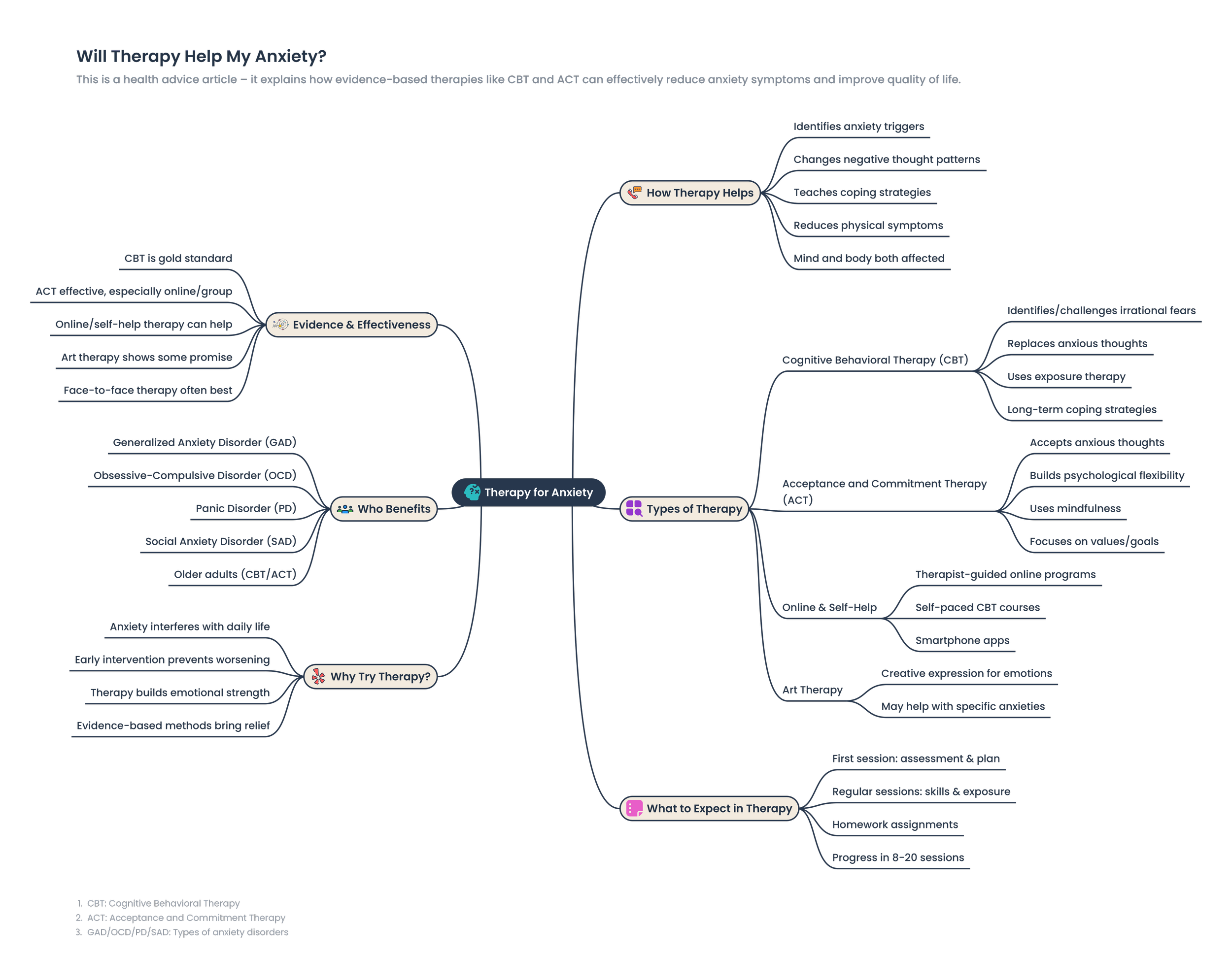 Regular Sessions: Youâll work on identifying and changing anxious thoughts, practicing coping skills, and gradually facing fears.